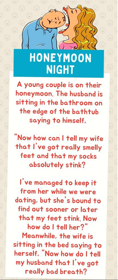 He walks over to the bed, climbs over to his wife, puts his arm around her neck, moves his face very close to hers and says, “Darling, I’ve got a confession to make.”