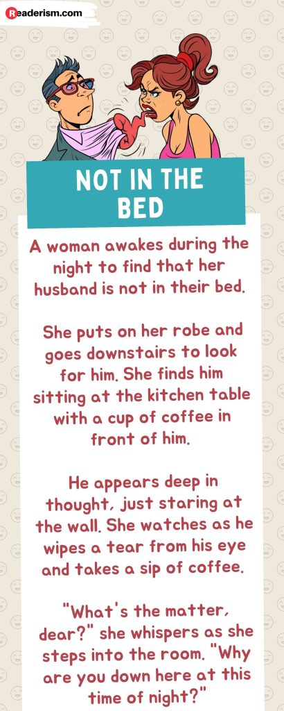 The wife is touched, thinking her husband is so caring and sensitive. “Yes, I do,” she replies.