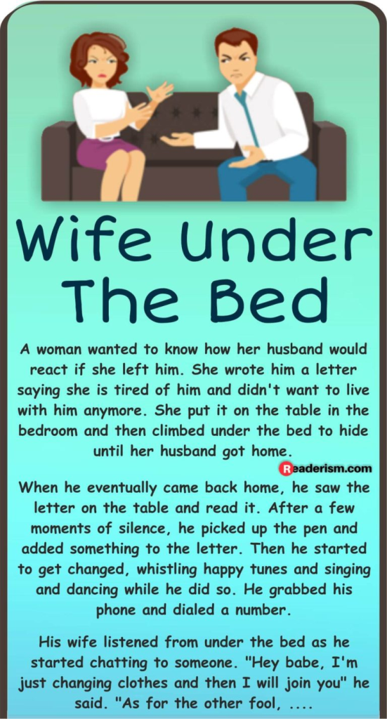 Heartbroken she climbed out from under the bed and stumbled over to read what her unfaithful husband had written on the end of her letter.